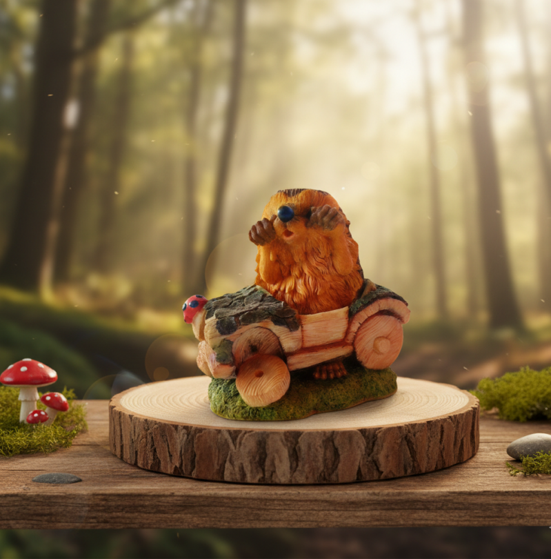 Bertie is behind the wheel of his trusted log mobile. But, as any good woodland traveler knows, not every road trip goes to plan. With one wheel popped off, maybe Bertie was distracted by an interesting mushroom, but our little friend is currently enjoying an unexpected roadside break