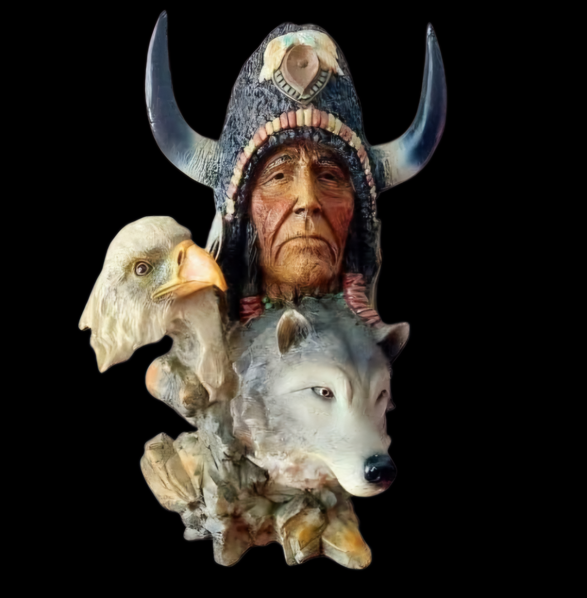 Native American Chief with wolf and eagle, handpainted resin wall plaque