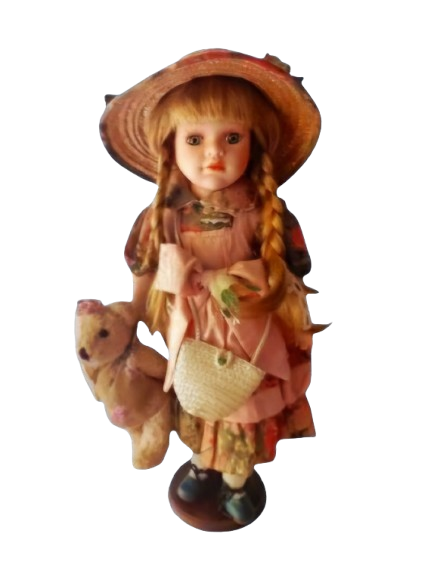 Perfectly perserved in a snapshot of a bygone era, complete with all her original charm, accessories and stand.