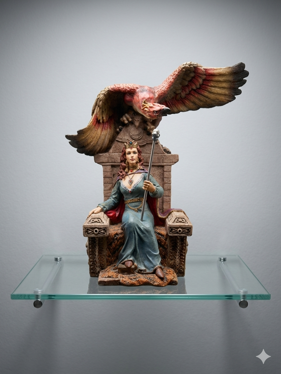 Rising behind her, a magnificent phoenix - like dragon arches its wings in a protective embrace. The creatures plumage is a stunning gradient of fiery crimson, burnt orange, and deep sable, its sharp eyes ever watchful for threats to the crown.